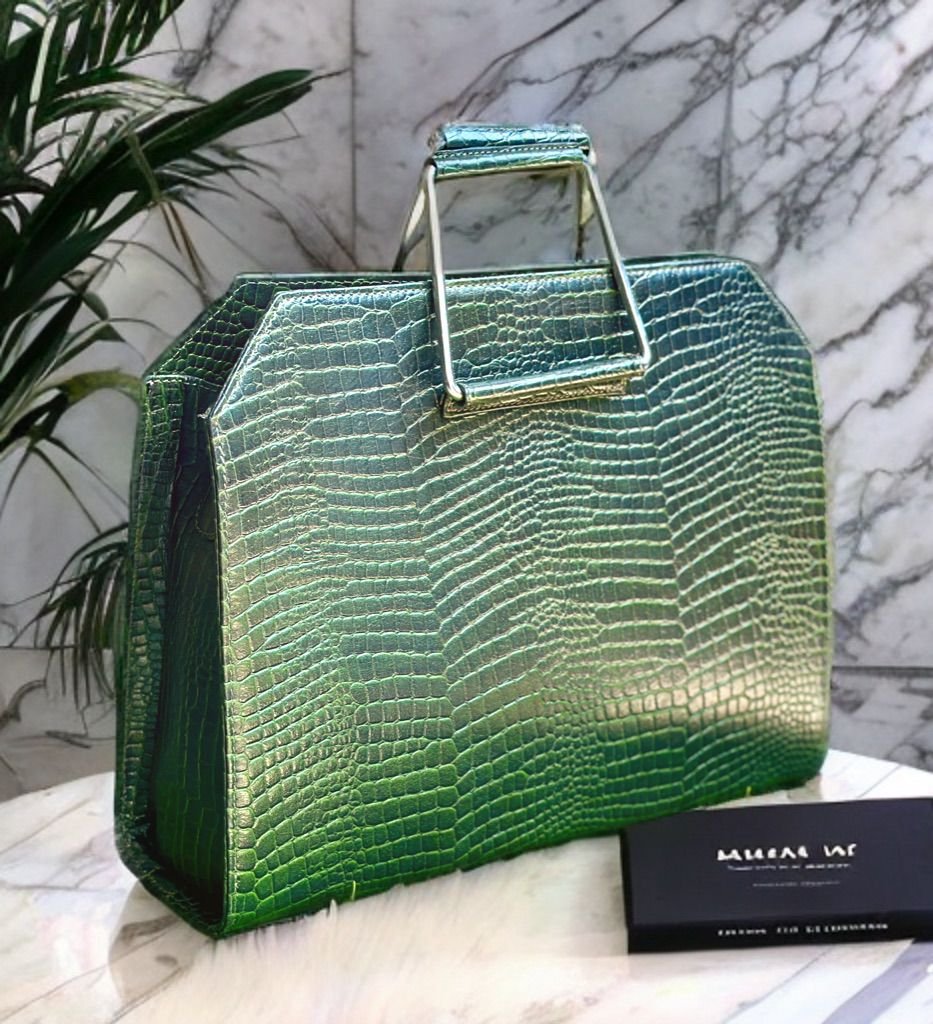 Make a bold entrance with this stunning handbag crafted from croc-textured leather and finished in a mesmerizing iridescent hue that shifts between emerald green and violet. Its structured silhouette is enhanced by sharp edges and a unique metallic geometric handle, blending elegance with a futuristic twist. Perfect for both day and evening wear, this bag is a true conversation starter—where luxury meets art.