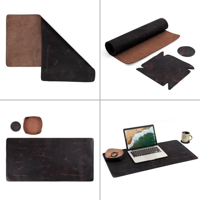 Elevate your workspace with this handcrafted vintage leather desk mat set, combining elegance and utility. Made from high-quality distressed leather, the set includes a spacious desk pad, round coaster, and a foldable catch-all tray for accessories. Its dual-tone finish adds a touch of sophistication, while the supple suede underside ensures non-slip stability. Ideal for laptops, writing, or creative work, this set keeps your essentials organized and your desk protected—all while looking timelessly stylish. Perfect for home offices, studios, or executive desks.